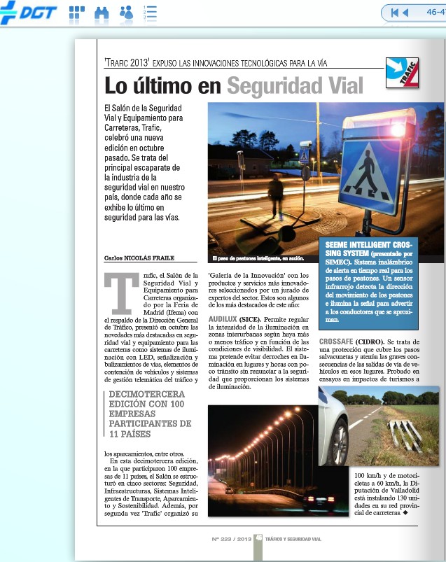 En la edición número 223 de la revista oficial de la Dirección General de Tráfico («Tráfico») se hace eco del CROSSAFE como uno de los productos innovadores en el sector de la Seguridad Vial.