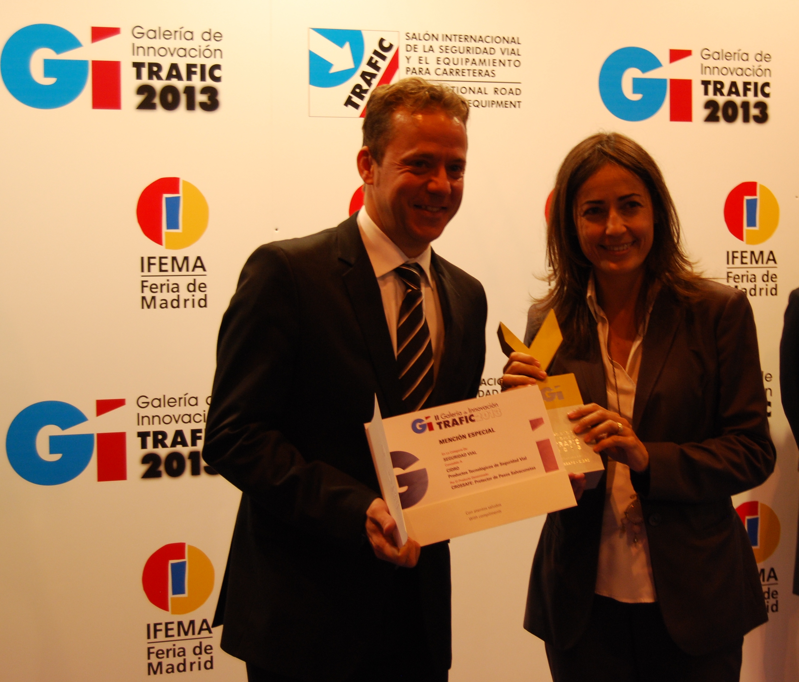 Esta pasada semana, el protector de pasos salvacunetas CROSSAFE de CIDRO ha recibido la Mención Especial como el producto más innovador en Seguridad Vial de la décimotercera edición del Salón Internacional de la Seguridad Vial y el Equipamiento para Carreteras, TRAFIC, organizado por IFEMA y que ha reunido a un centenar de empresas, en la FERIA DE MADRID. La Directora General de Tráfico, María Seguí, hizo entrega de este galardón a Cidro.